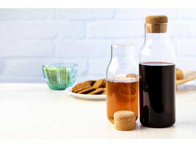 Borosilicate glass water carafe with cork lid, 1000 ml. Suitable for both cold and hot drinks, it can be also used as a decanter bottle.