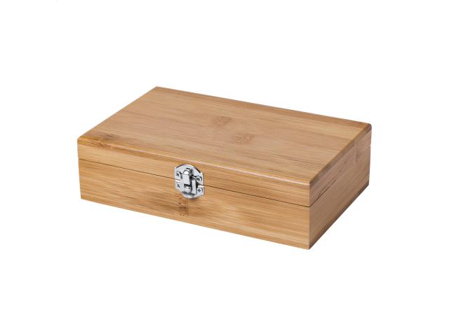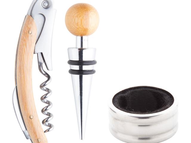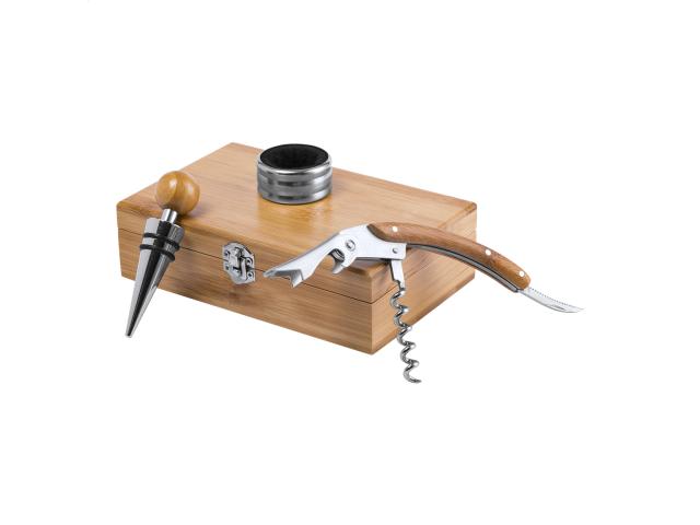 Bamboo wine set with corkscrew, drop stopper and plug in bamboo box.