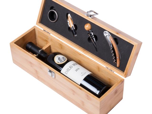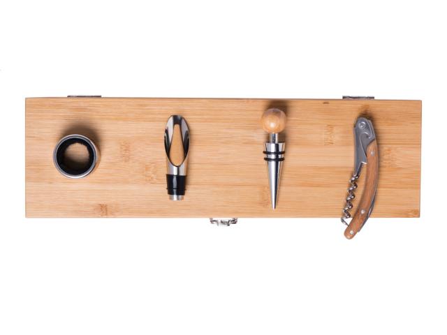 Bamboo wine set with corkscrew, drop stopper, nozzle and plug. In bamboo box with a compartment for a bottle of wine. Delivered without bottle.