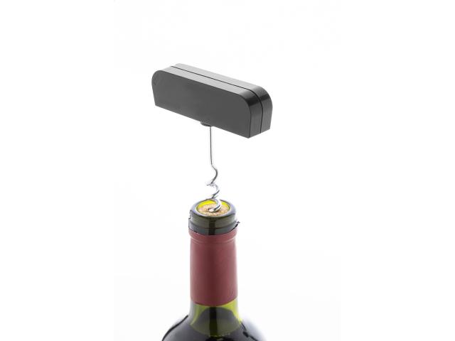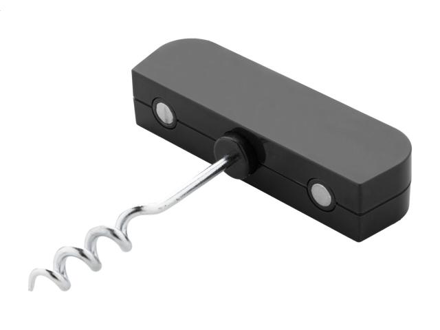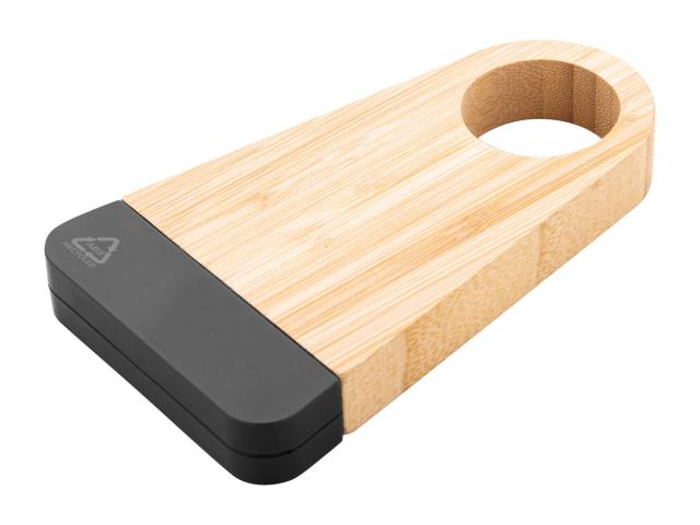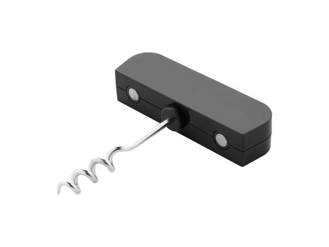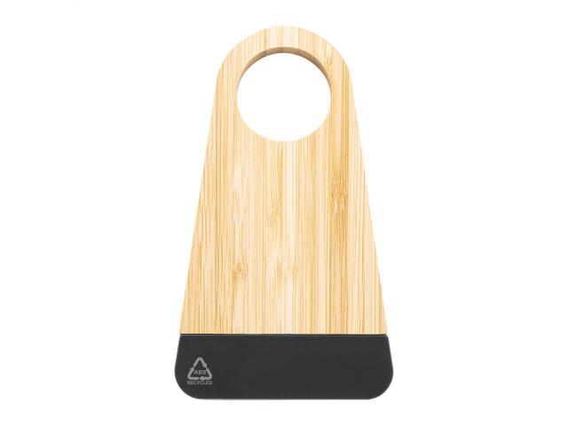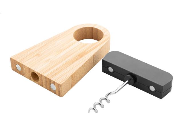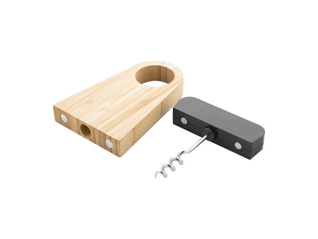 Bamboo and recycled ABS wine bottle holder with stainless steel corkscrew.