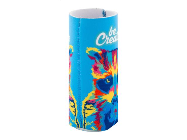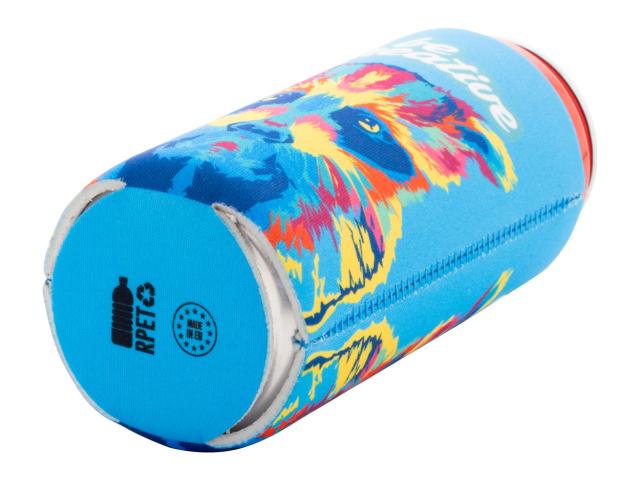 Custom made, RPET neoprene cooler cover for 0,33 L sleek-type aluminium can. With all over sublimation printed graphics. MOQ: 50 pcs.