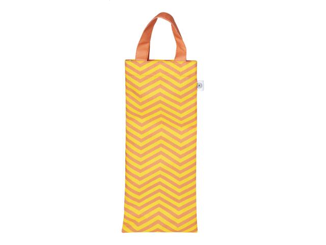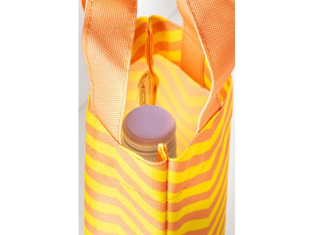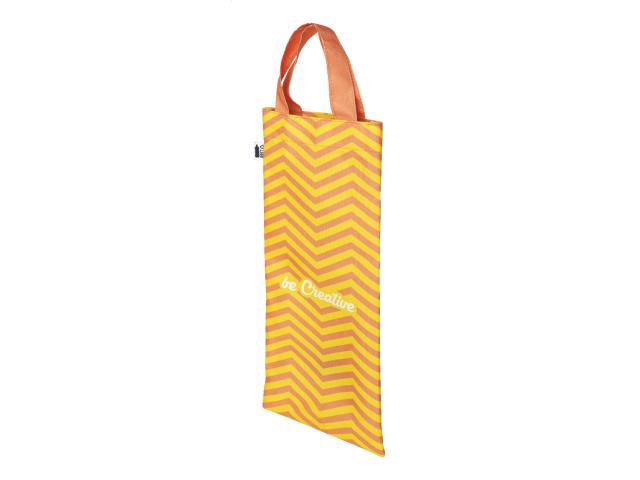 Custom made, 600D RPET polyester wine bag with short handles. With all over sublimation printed graphics and distinctive RPET label. MOQ: 25 pcs.