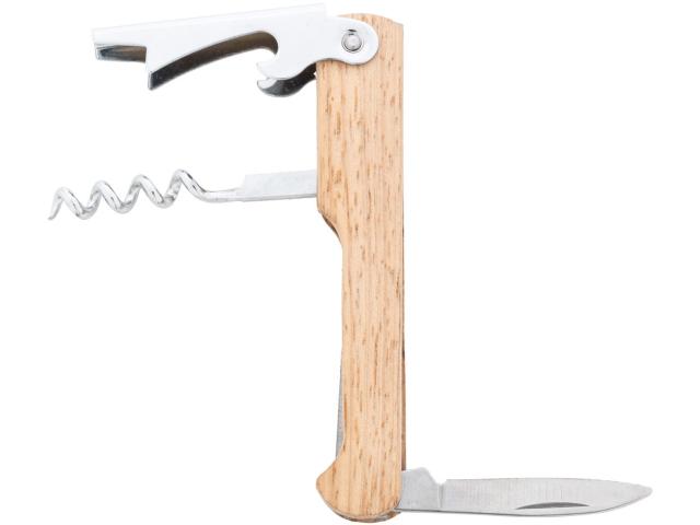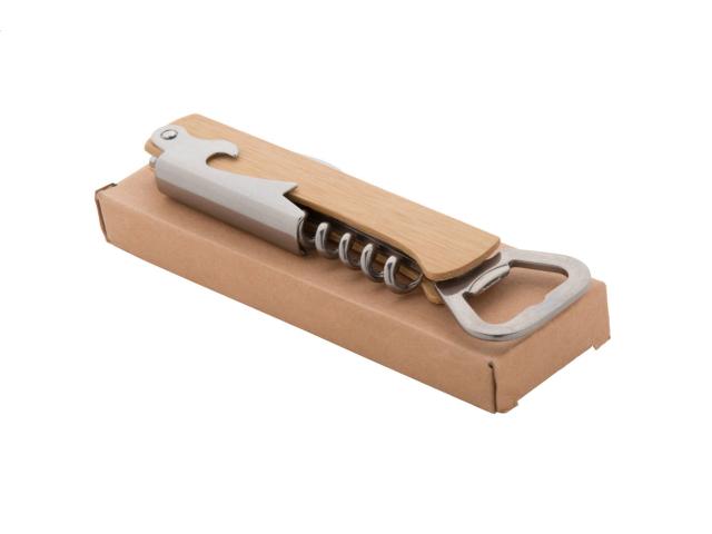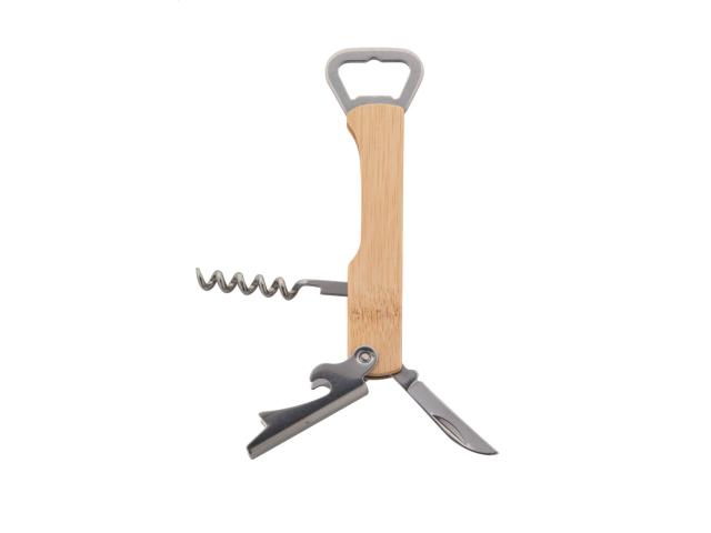 Stainless steel bottle opener and corkscrew with bamboo handle.