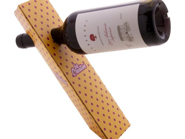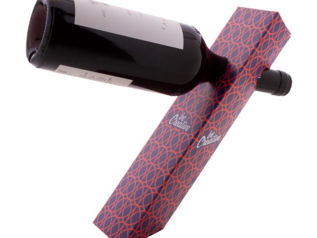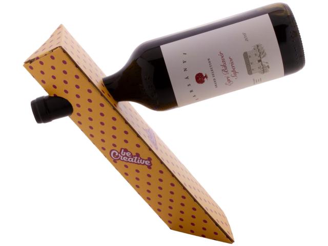 Custom made, full colour printed corrugated cardboard gravitational wine bottle holder. Delivered flat-packed. MOQ: 50 pcs.