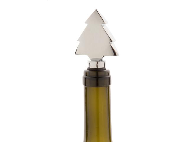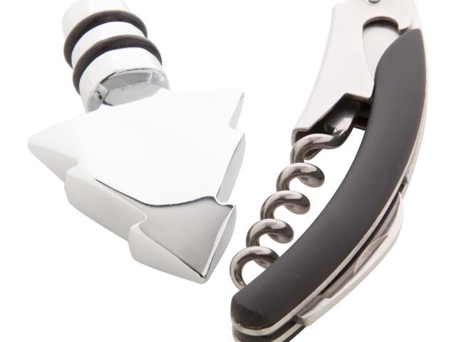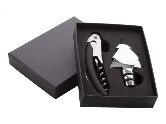 Wine set with corkscrew and cork with Christmas tree on the top. In black gift box.