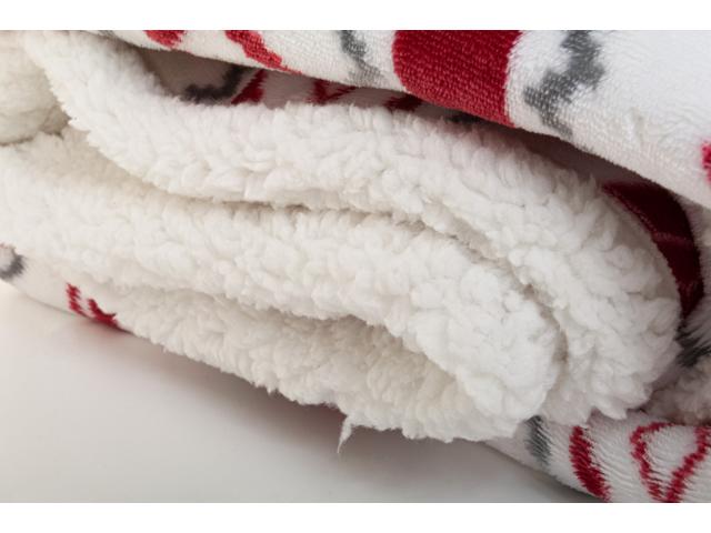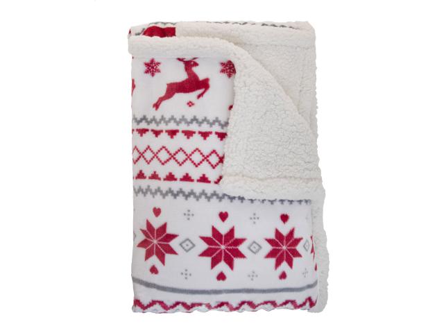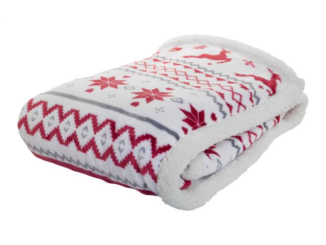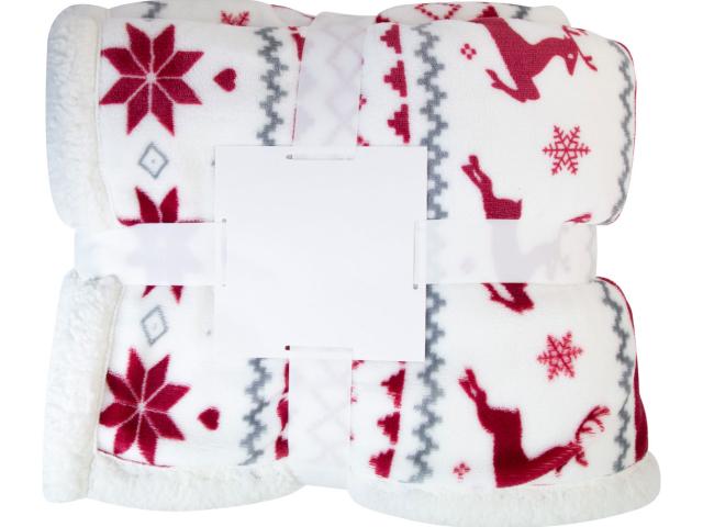 Dual-layer RPET Christmas blanket with 230 g/m² RPET flannel fleece and reversible 210 g/m² RPET sherpa fleece lining. Wrapped in ribbon and printable paper card.
