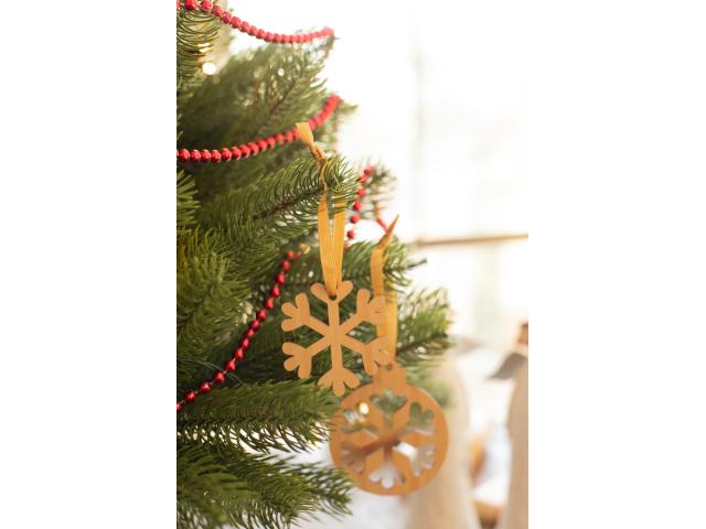 2in1 Christmas tree ornaments in bamboo plywood with golden ribbons. Delivered with detached ribbons.