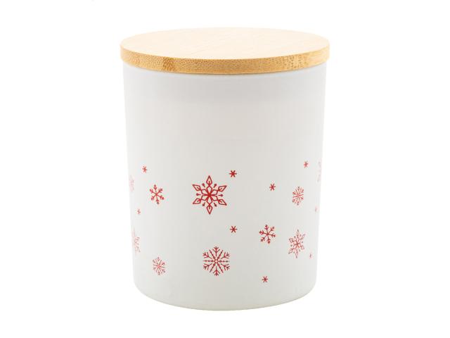 Scented plant-based wax candle in frosted glass holder with Christmas snowflake decoration and bamboo lid. With 120 grams of wax. In kraft paper box.