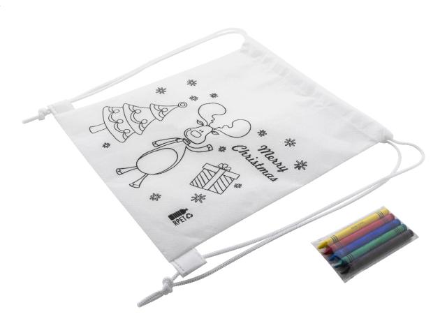 Colouring Christmas drawstring bag in RPET non-woven with 5 crayons.
