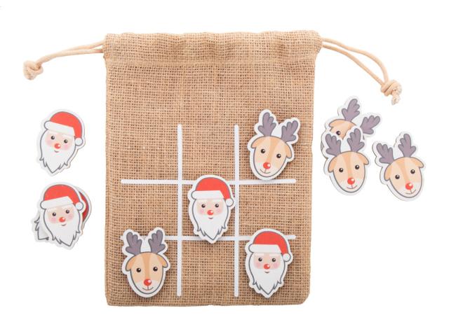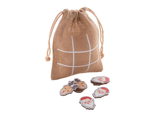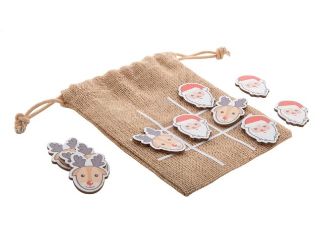 Christmas design tic-tac-toe game in birch plywood with 10 tokens and jute carry pouch.