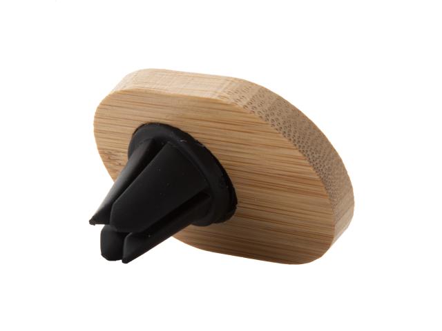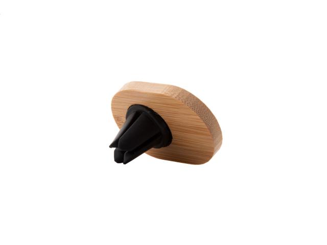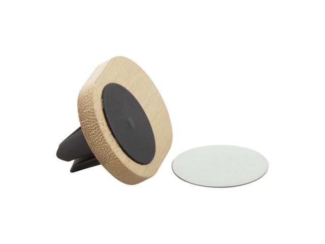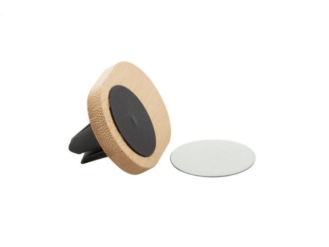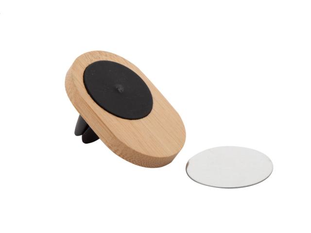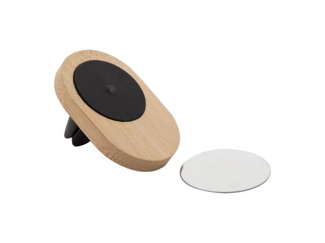 Bamboo, magnetic car mobile holder with air vent mounting. Including self-adhesive metal plate. In kraft paper box.