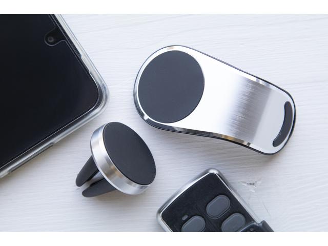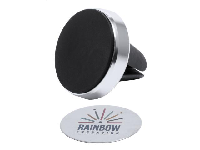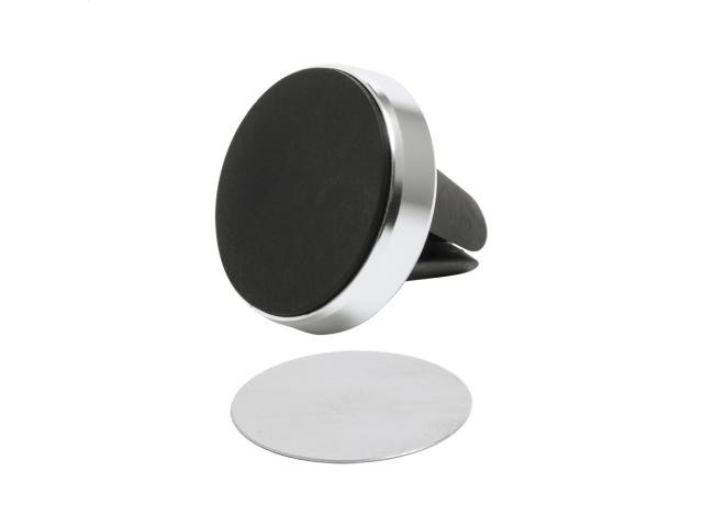 Aluminium, magnetic car mobile holder with air vent mounting. Including self-adhesive metal plate. In gift box.