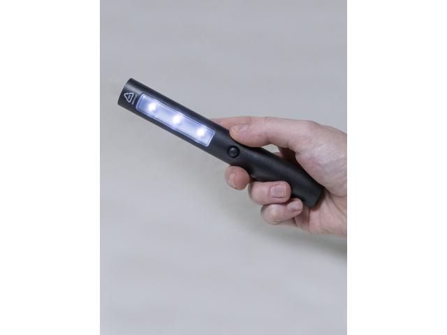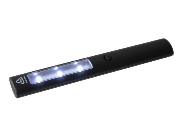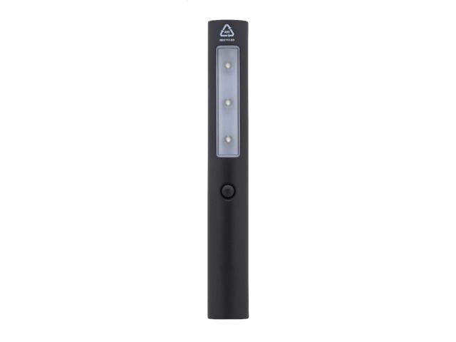 Recycled ABS emergency car flashlight with 3 LEDs and magnets on the back for hands-free use. Including button cell batteries.