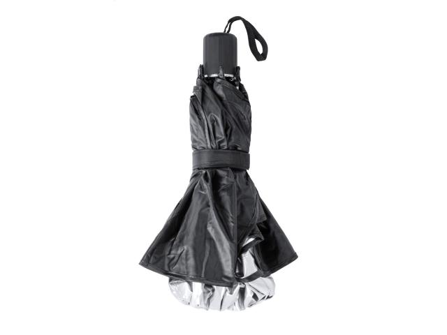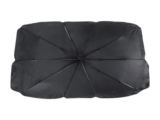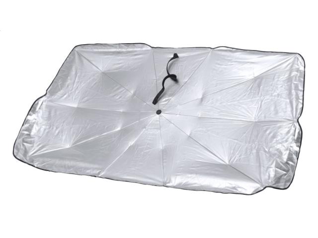 Foldable car sunshade umbrella for windshield with metal frame. In polyester pouch.