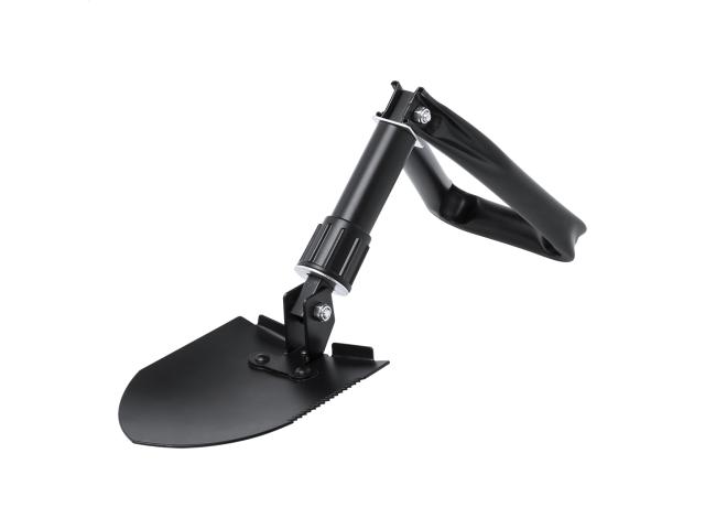 Foldable, carbon steel emergency shovel with carry pouch.