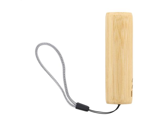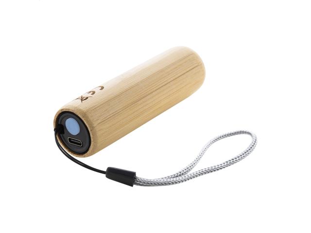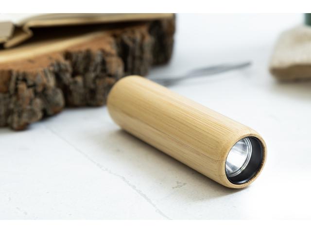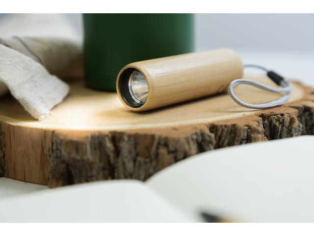 Bamboo flashlight with built-in USB rechargeable battery (320 mAh), 1 LED light and carry strap. With 3 light modes. Including USB charger cable.