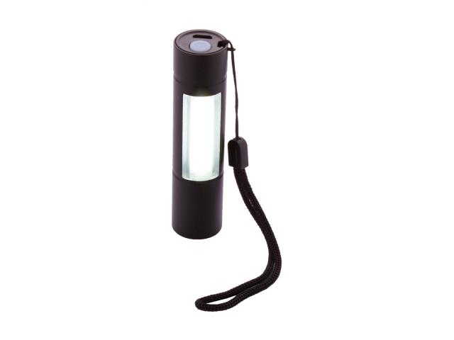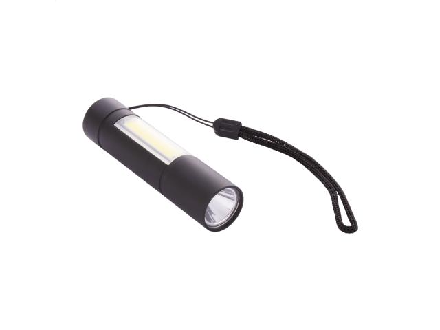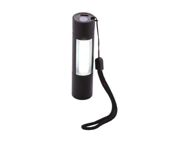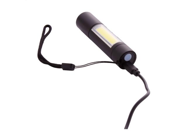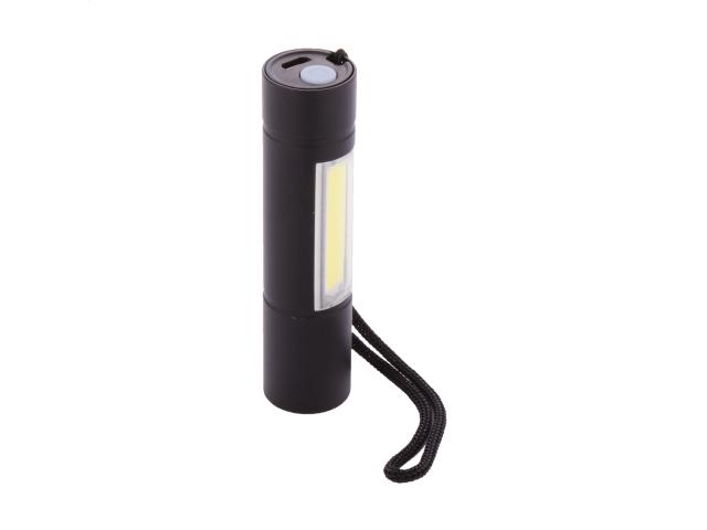 Aluminium flashlight with built-in USB rechargeable battery (400 mAh) and carry strap. With high power COB light at the font and COB floodlight on the side. With fixed and flashing light modes. Including USB charger cable.
