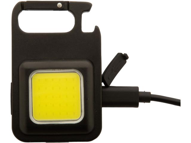 Multifunctional, aluminium flashlight with high power COB floodlight and built-in USB rechargeable battery (400 mAh). With carabiner, magnet and bottle opener. With high, low and flashing light modes. Including USB charger cable.