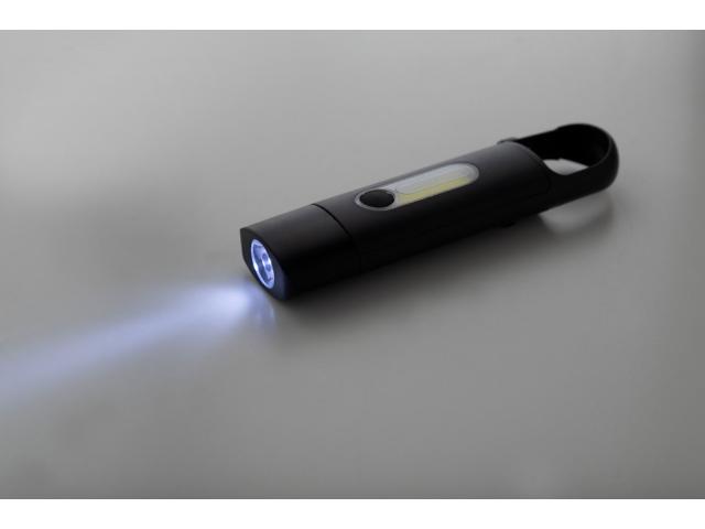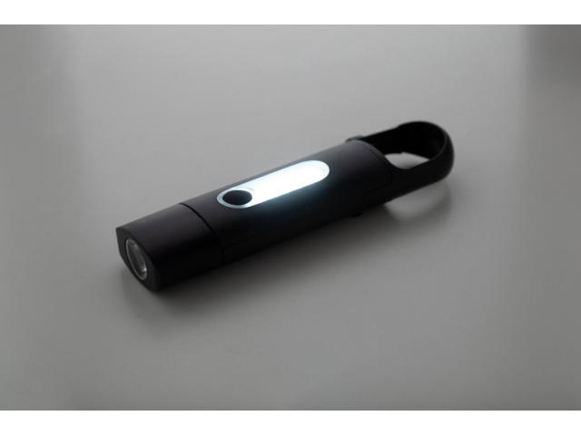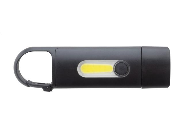 Recycled ABS mini flashlight with built-in USB rechargeable battery (200 mAh) and carabiner. With COB light at the font and COB floodlight on the side. With 3 light modes. Including USB charger cable.