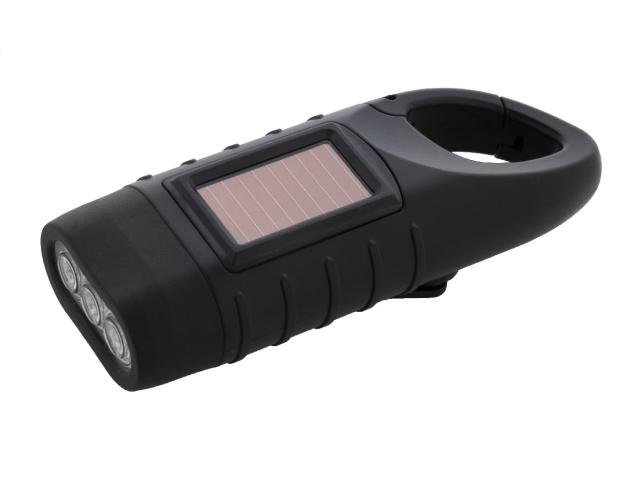 Recycled ABS flashlight with 3 LEDs, built-in solar and dynamo chargers, and carabiner clip.
