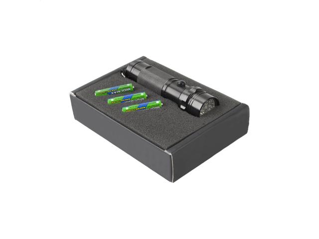 Aluminium, 14 LED flashlight in black gift box. With 3 AAA batteries.