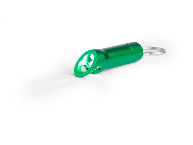 Mini, aluminium flashlight with 3 LED, bottle opener and keyring. With button cell battery.