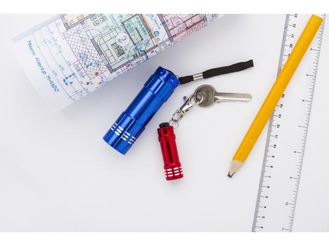Mini, aluminium flashlight with 3 LED and carabiner on the top. With button cell batteries.