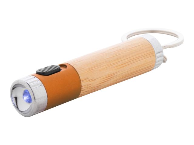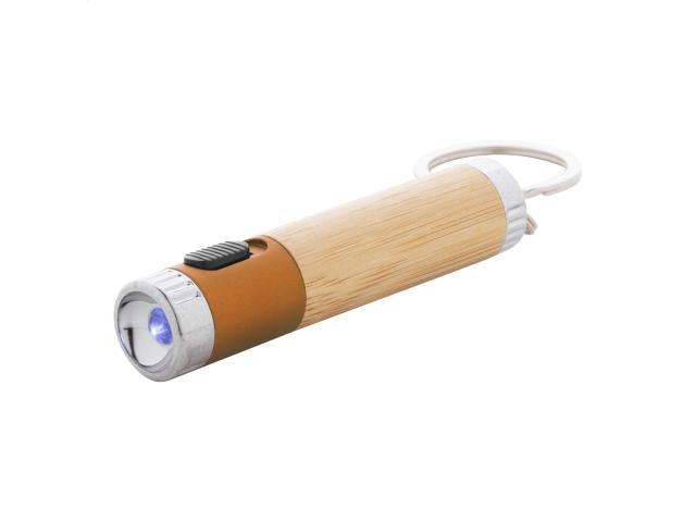 Bamboo and recycled ABS plastic mini flashlight with 1 LED and metal keyring. With button cell battery.