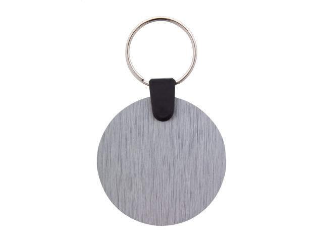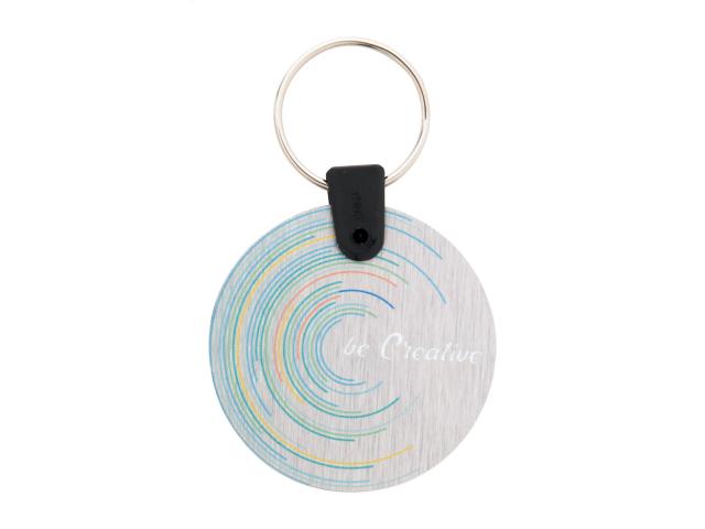 Round shaped, brushed aluminium composite keyring with full colour printing. Price includes UV LED printing on one side. MOQ: 100 pcs.