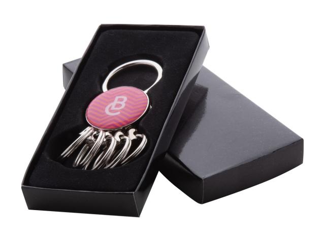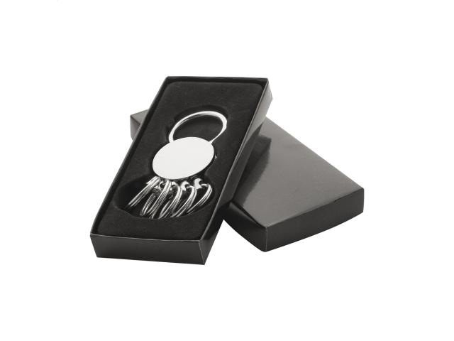 Metal round shaped keyring with 5 detachable rings. In black gift box.