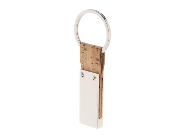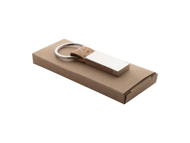 Rectangular metal keyring with natural cork and PU leather strap. In kraft paper box.
