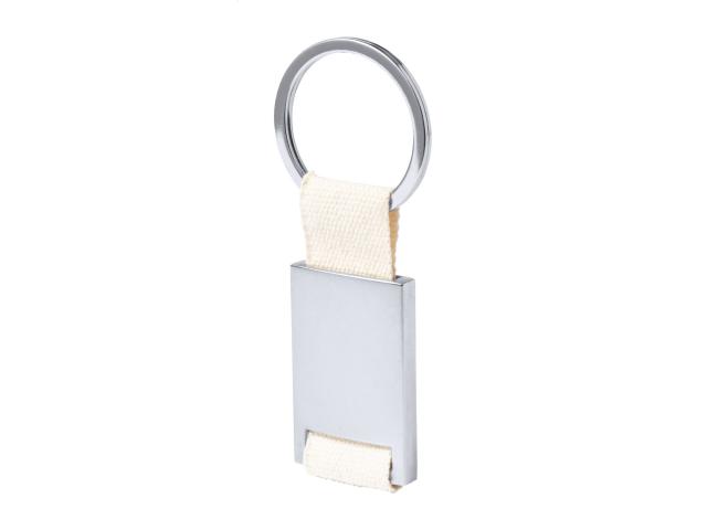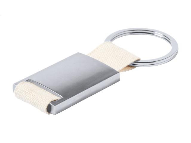 Rectangular metal keyring with cotton strap and metal ring.