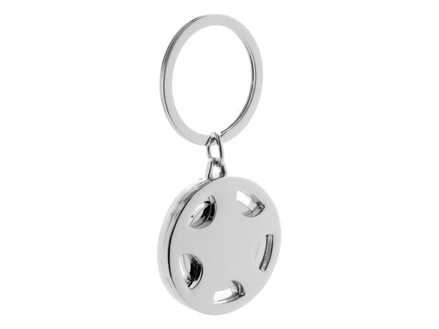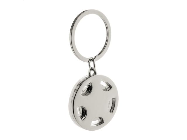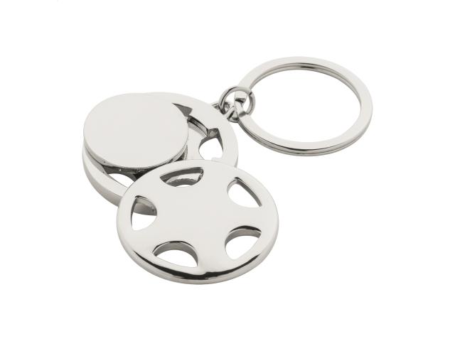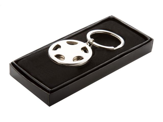 Car wheel shaped metal keyring with shopping trolley coin, in black gift box.