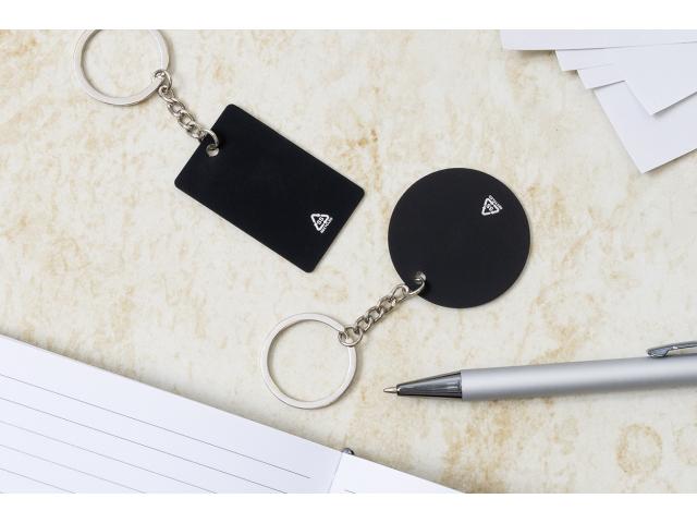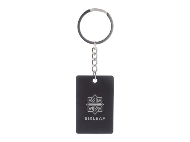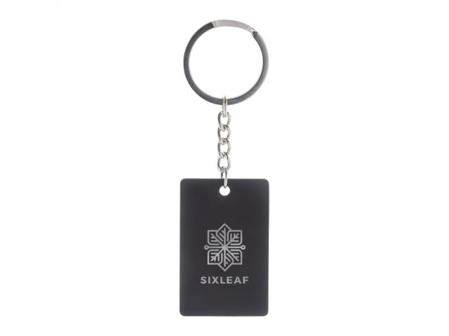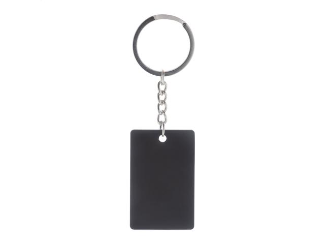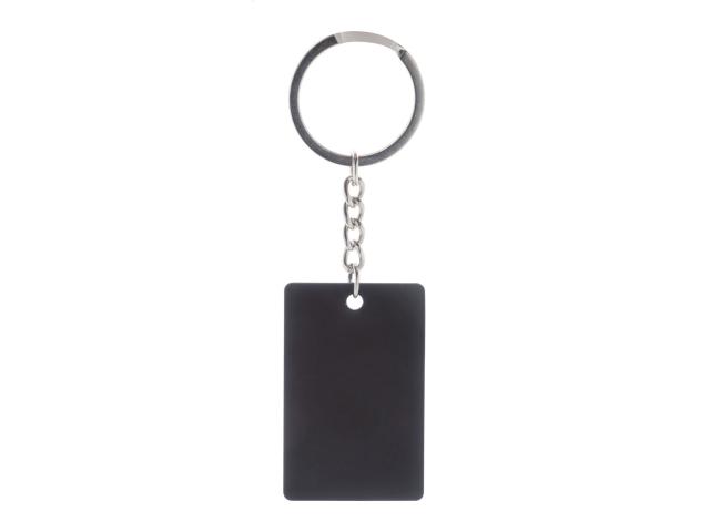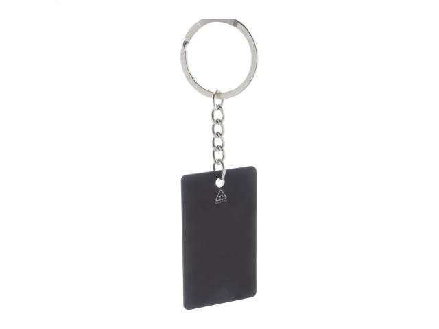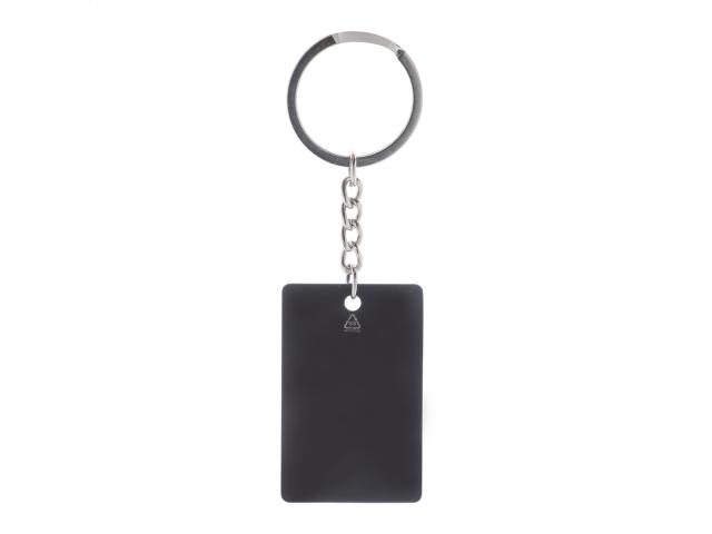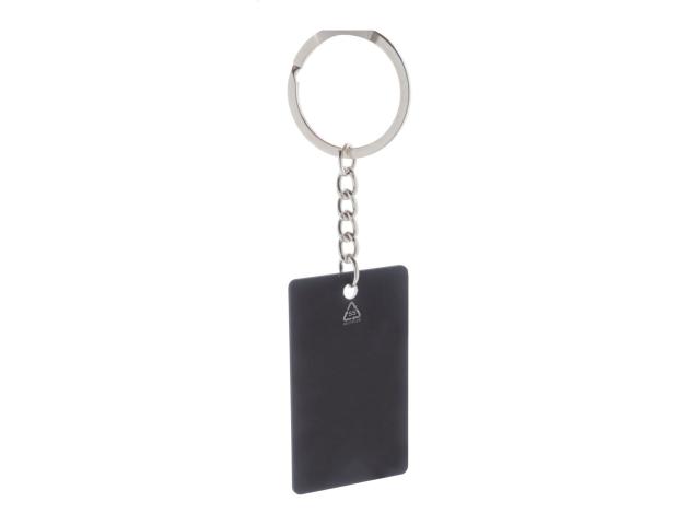 Rectangular shaped, recycled stainless steel keyring with rubberized finish. With special coating for mirror laser engraving.