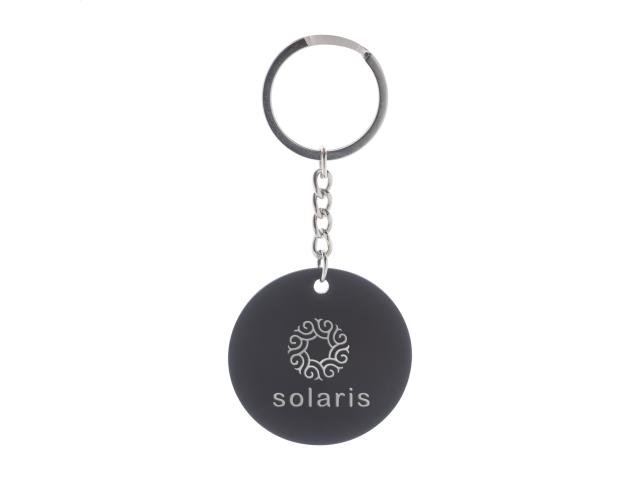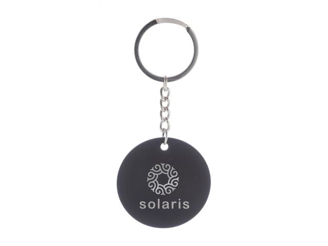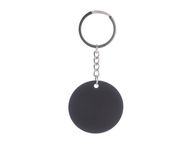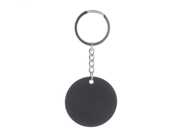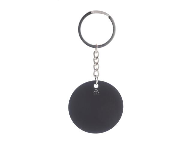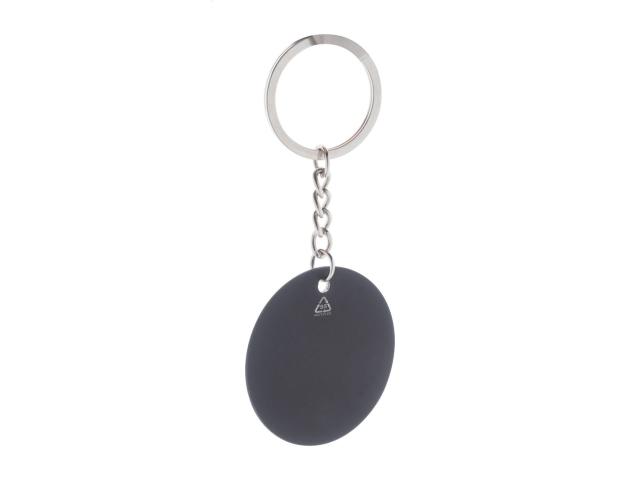 Round shaped, recycled stainless steel keyring with rubberized finish. With special coating for mirror laser engraving.