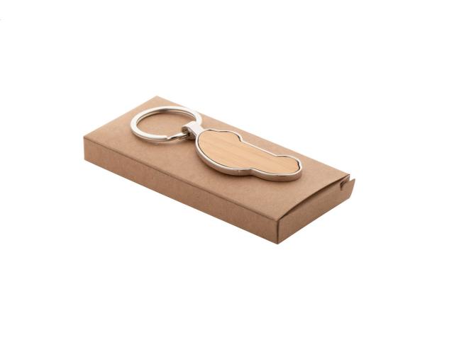Car shaped metal keyring with bamboo insert. In kraft paper box.