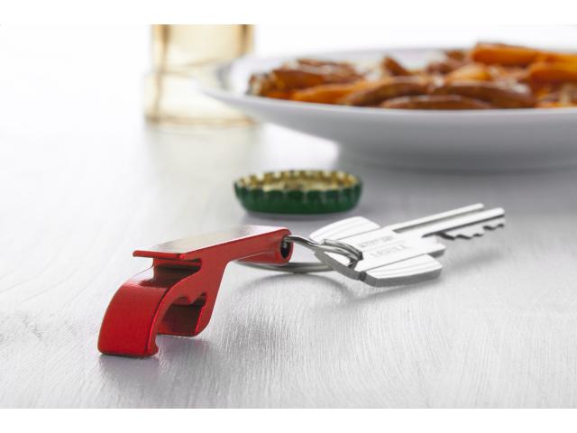 Aluminium bottle and can opener with keyring.