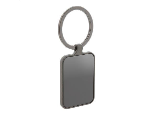 Rectangular shaped metal keyring with gunmetal finish and shiny plates on both sides. In black gift box.
