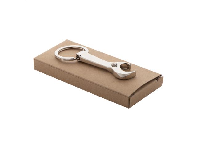 Wrench shaped, metal bottle opener keyring. In kraft paper box.
