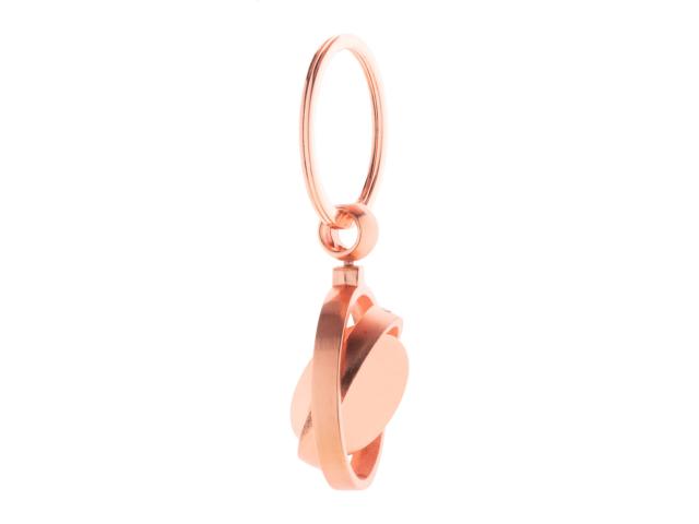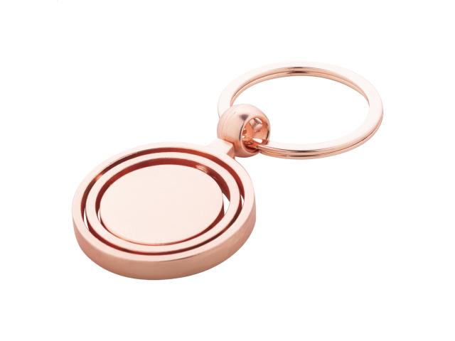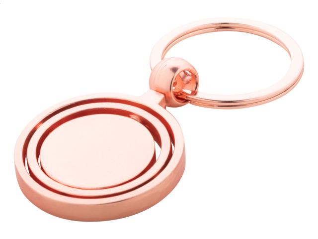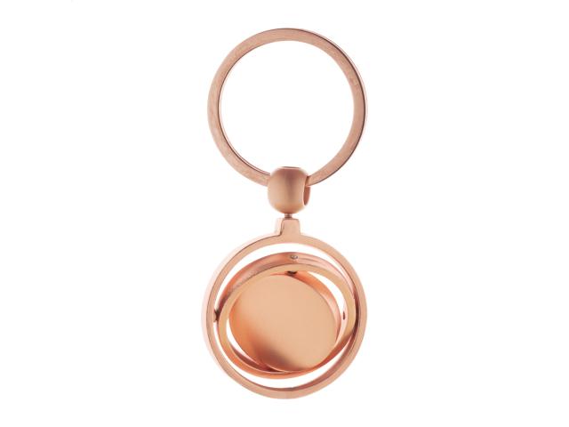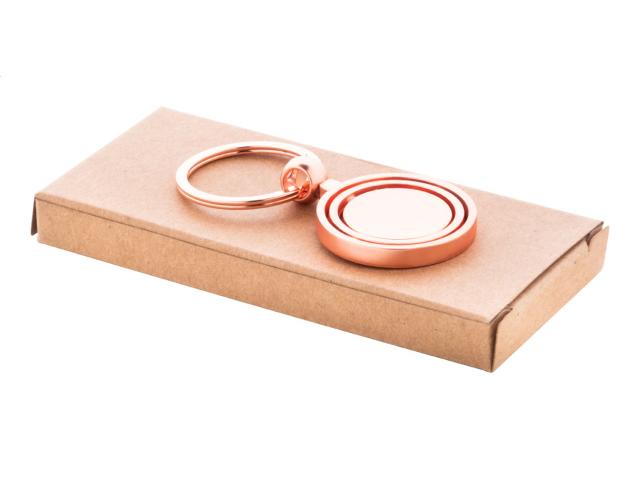 Metal keyring in golden finish with rotating inside part. In kraft paper box.