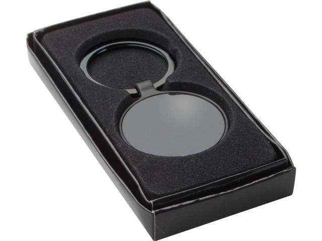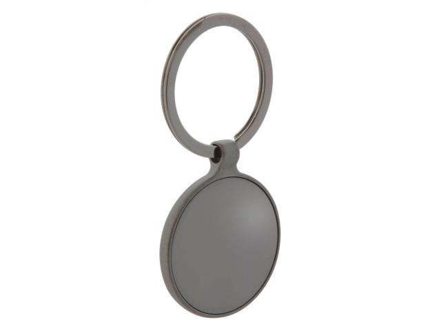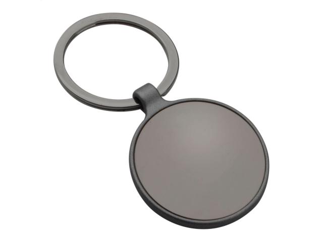 Round shaped metal keyring with gunmetal finish and shiny plates on both sides. In black gift box.