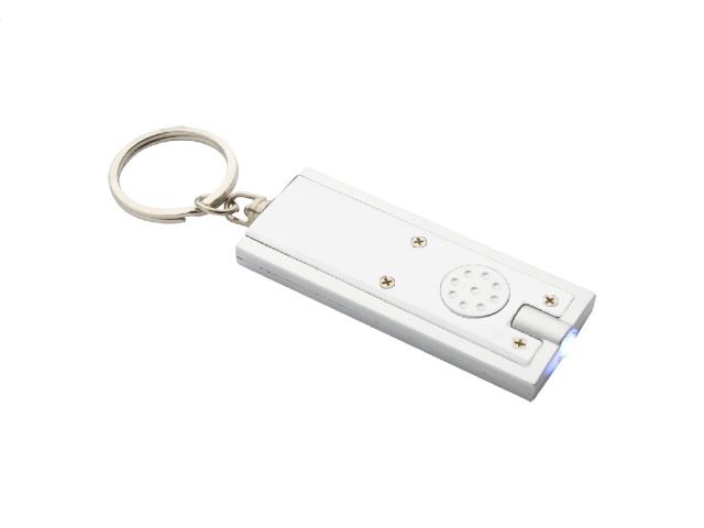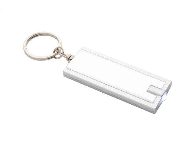 Recycled ABS keyring with LED flashlight and metal keyring. With button cell batteries.