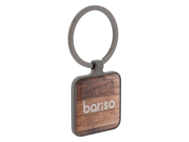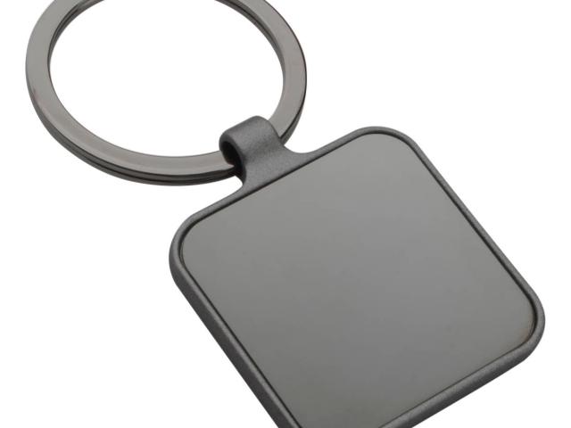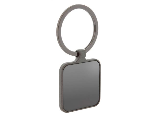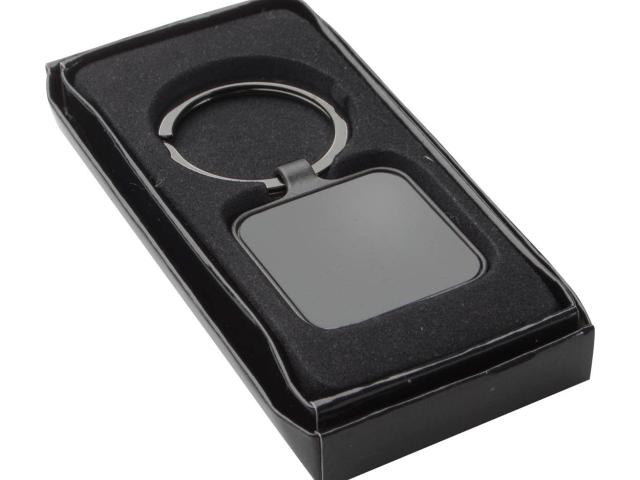 Square shaped metal keyring with gunmetal finish and shiny plates on both sides. In black gift box.