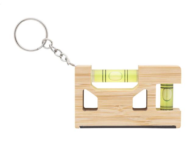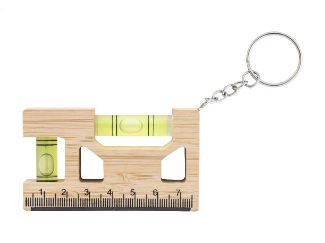 Multifunctional, bamboo keyring with metal ring, ruler, magnet and dual spirit levels.