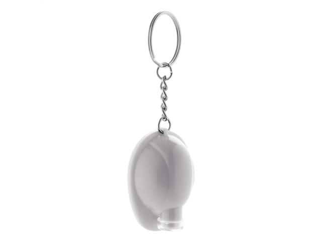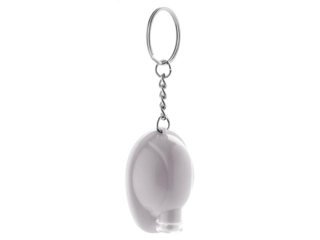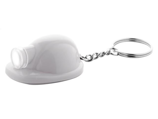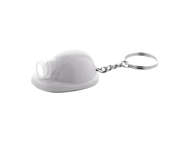 Plastic safety helmet shaped keyring with LED flashlight. With button cell battery.