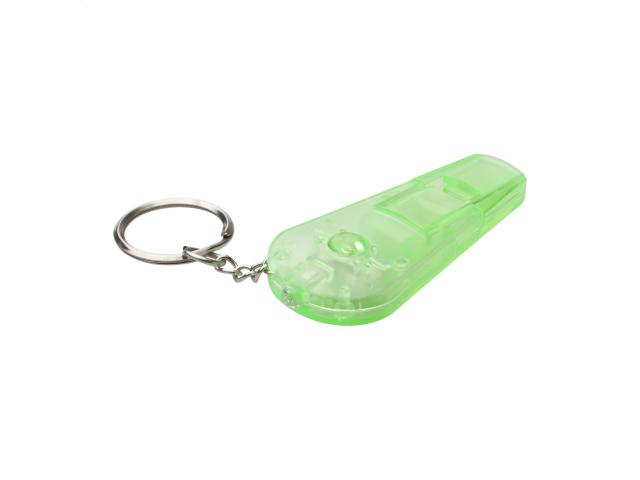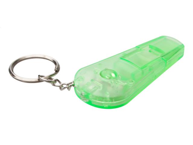 Transparent coloured plastic whistle with keyring and mini flashlight. With button cell battery.