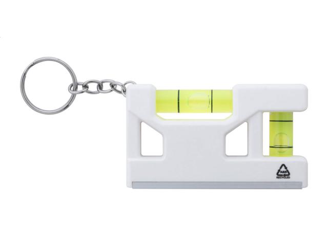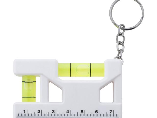 Multifunctional, recycled ABS keyring with metal ring, ruler, magnet and dual spirit levels.