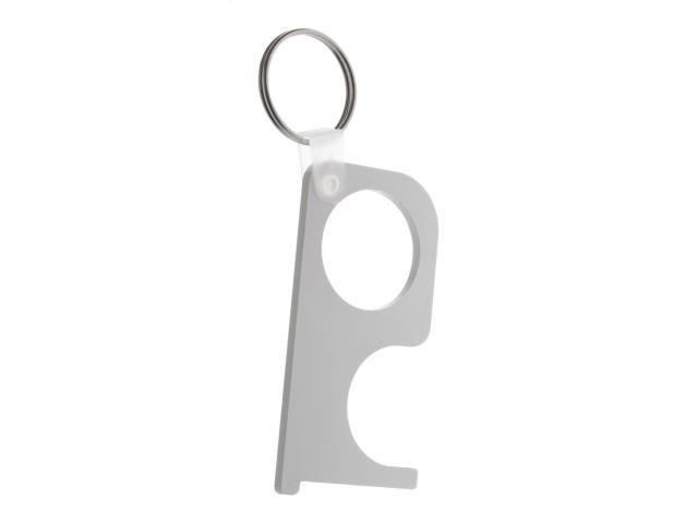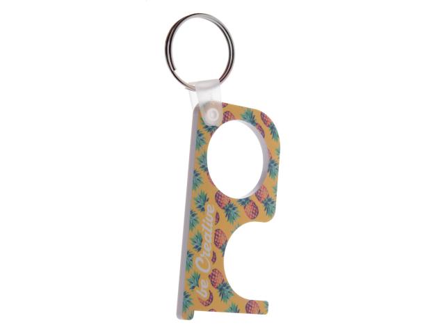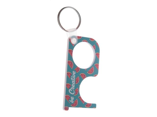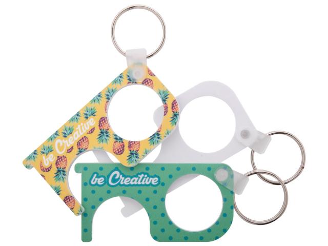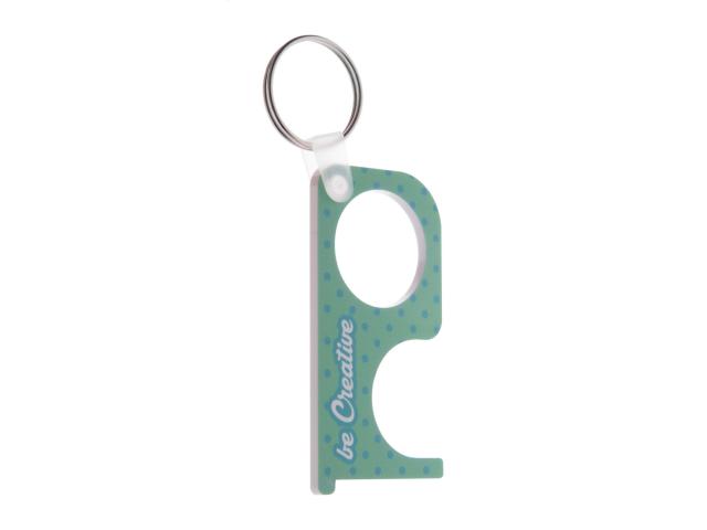 Practical hygiene key in acrylic with custom graphics, for pushing buttons and opening doors without direct contact. It can be also used as a keyring with the included metal ring. Price includes UV LED printing on one side. MOQ: 250 pcs.