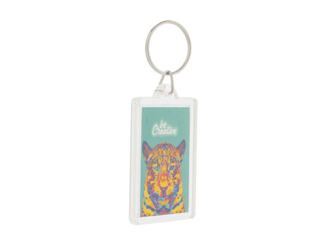 Rectangular shaped acrylic keyring with custom full colour paper insert and metal ring. Price includes digital printing on both sides. MOQ: 100 pcs.