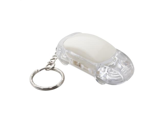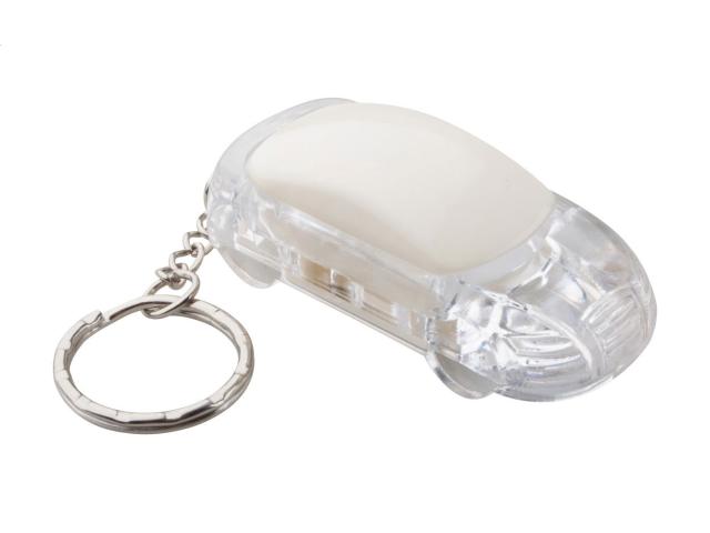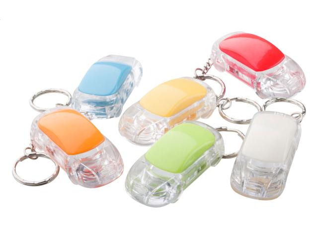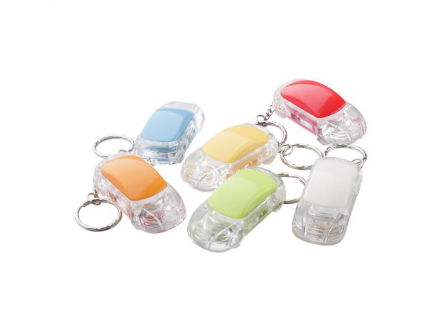 Car shaped plastic keyring with white LED flashlight and metal ring. With button cell battery.